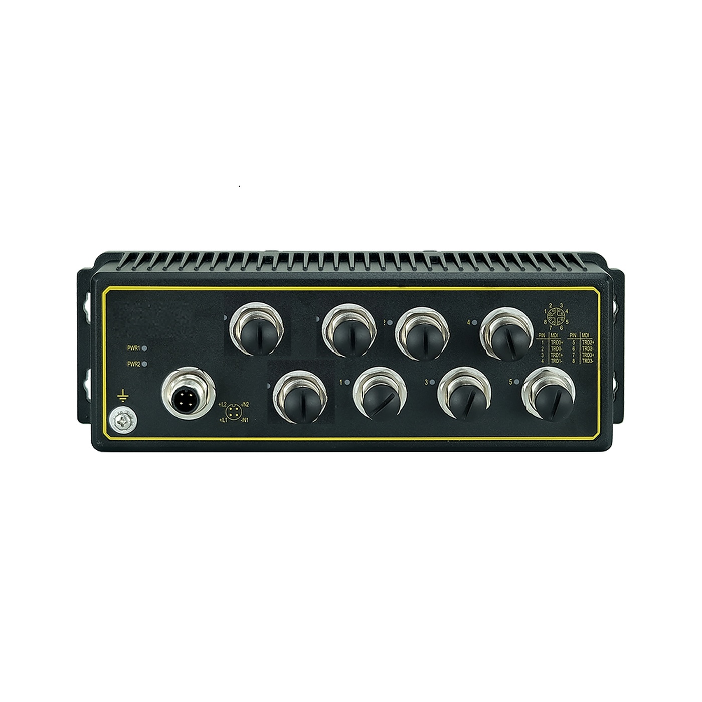 Промышленный 8-портовый неуправляемый коммутатор (без логотипа), 8 портов 10/100Base-TX M12, резервируемое питание 18-30VAC/12-48VDC(18-30VAC/9-60VDC), EN50155, IP67, -40...+75C