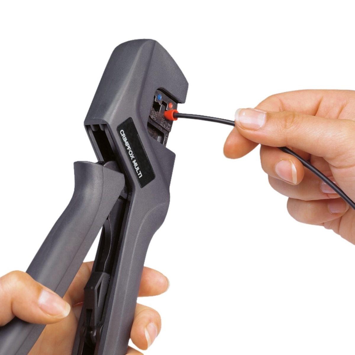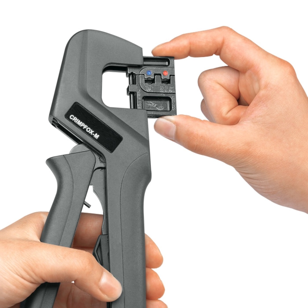 Комплект инструмента для обжима, состоит из клещей CRIMPFOX-M и матриц для изолированных кабельных наконечников 0,5 ... 2,5 мм² (1212074), неизолированных наконечников с отверстием 0,5 ... 6 мм² (1212079) и кабельных наконечников 0,25 ... 10 мм² (1212080) и 16/25 мм² (1212081).