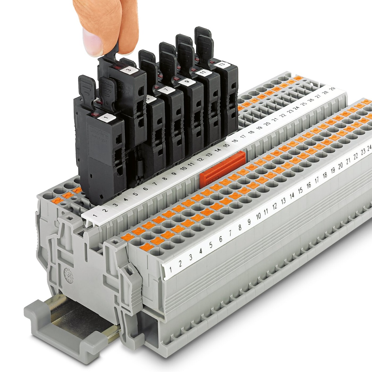 Штекерный держатель предохранителя, Перед заменой плавкого предохранителя извлеките штекерный модуль из основной клеммы., номинальное напряжение: 500 В, номинальный ток: 6,3 A, тип предохранителей: G / 5 x 20, тип монтажа: Штекерный монтаж, цвет: черный