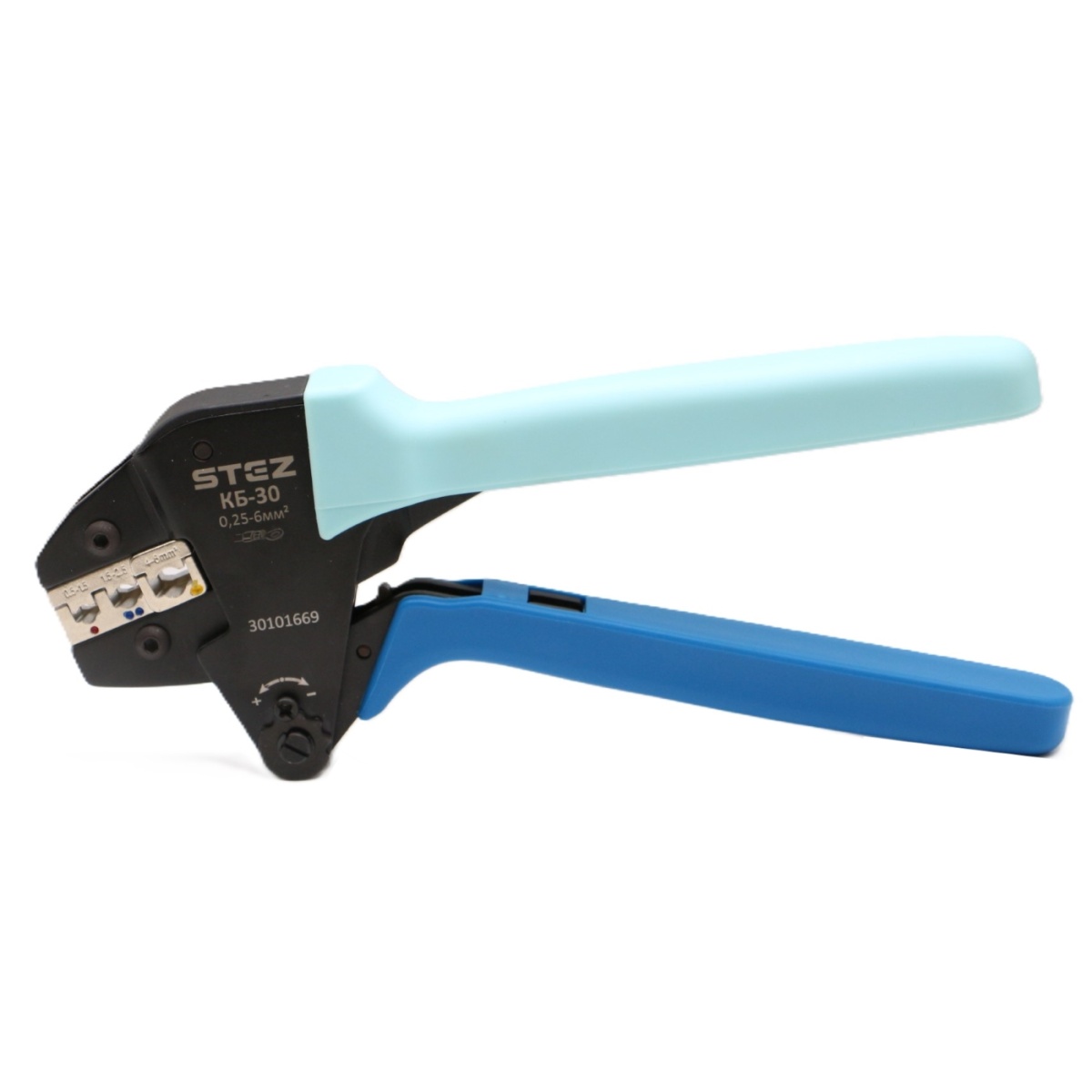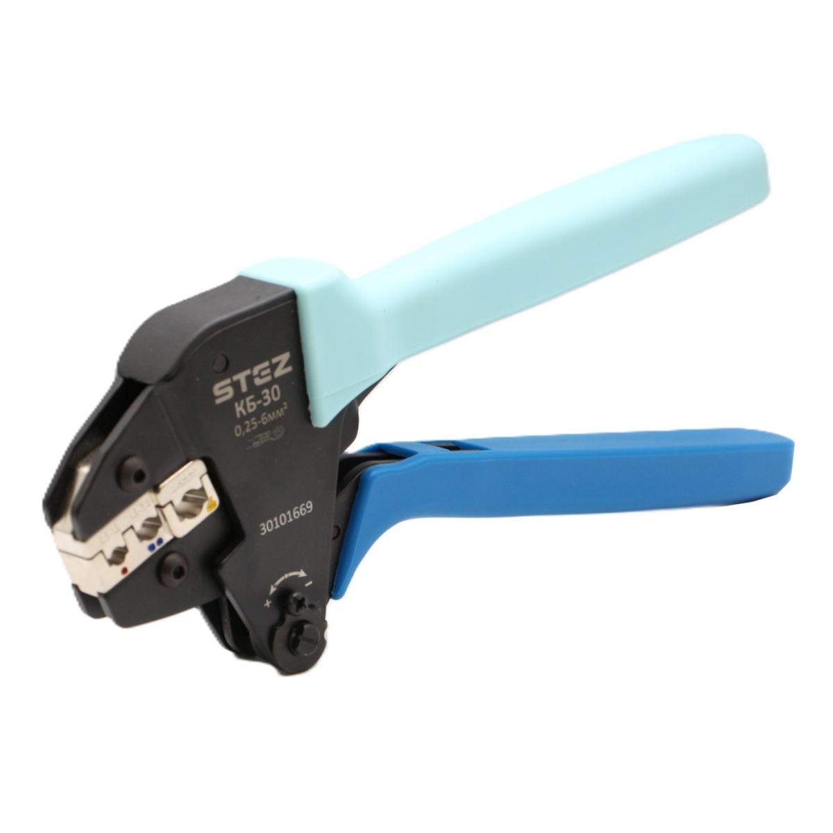 Клещи для обжима кольцевых наконечников с пластиковой юбкой (НКИ). Форма обжима – овал с двухсторонним ужимом, автоматически подстраивается под соответствующее сечение и позволяет выполнить надежное обжатие. Диапазон обжимаемых сечений 0,25…6 мм², AWG 23…9. Длина: 205 мм. Масса: 0,556 кг