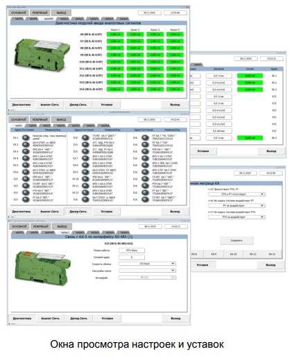 Для обеспечения удобной эксплуатации, вся информация организована в виде окон отображения мнемосхем, задания настроек, контроля и диагностики, а также просмотра сообщений и отображения графиков. На всех окнах вверху слева отображается режим работы шкафа - «Вывод», «Основной» или «Резервный», а справа - текущая дата и время.