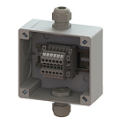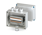 Серия D - распределительные клеммные коробки из полиамида, с защитой IP56. Типовое количество клеммных зажимов 6, 12 и 24шт. Кабельный ввод пластиковый, М20 от 2 до 4шт. в зависимости от модели. Может эксплуатироватся внутри и вне помещений при температурных диапазонах -25 °C ... +60 °C. Клеммные зажимы производства СТЭЗ: КНЗ, КНВ и КНБ.